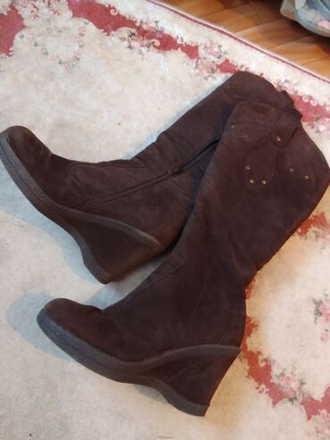 Ženske čizme do kolena na punu petu (wedges), tamno braon boje.