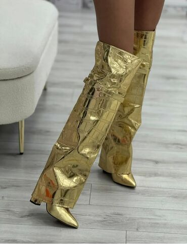 - Dizajn: visoke čizme široke nogavice (slouch/over-the-knee), špicasti vrh, stabilna blok potpetica srednje visine.