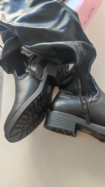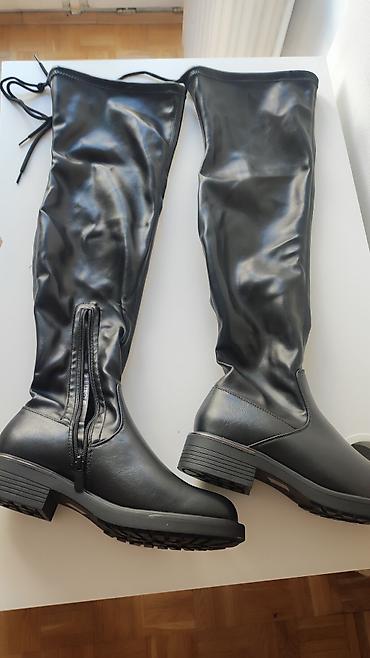 Ženske visoke čizme do kolena, crne. U savršenom stanju, nošene samo po sobi, prodajem zato što su mi male. - Materijal: gornji deo kombinacija glatke eko-kože i elastične tekstilne strane koja ...