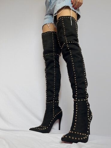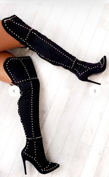 CrnaCrne ženske čizme preko kolena sa visokom potpeticom i špicastim vrhom. Materijal izgleda kao brušena eko-koža/antilop. Dekorisane su nizovima metalnih nitni u zlatnoj boji duž celog gornjišta, oko prstiju i pete, što daje upečatljiv rock-glam izgled. Uska silueta prati nogu, s blago naboranim efektom na listu. Tanka štikla visoka, sa stabilnom petom i blago izdignutom platformom u prednjem delu. Sa unutrašnje strane nalazi se rajsferšlus do polovine listova radi lakšeg obuvanja. Visina je iznad butina (thigh-high). Idealne za večernje kombinacije, haljine, suknje ili uske farmerke. Boja: crna. Detalji: zlatne nitne, špic, tanka visoka potpetica, bočni rajsferšlus.
