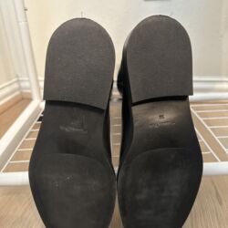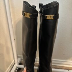 - Detalji: zlatni metalni ukras sa inicijalima “CD” na vrhu skaftova, diskretne petlje pozadi za lakše obuvanje