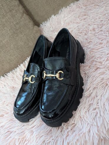 Crne ženske mokasine – lakovana koža, klasičan penny dizajn. - Brend/oznaka: Comfort (natpis na ulošku) - Veličina: 39 (otisnuto sa strane) - Materijal gornjišta: sjajni lak (lakovana završna...1 600 RSD