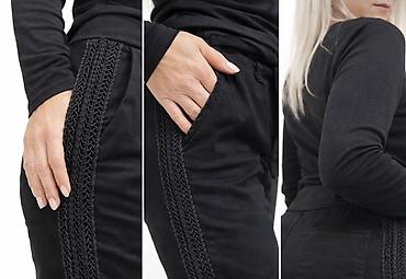 Crne ženske pantalone uskog kroja, sa elastičnim pojasom za udobnost. Poseduju dva bočna džepa za praktično odlaganje sitnica. Poseban detalj su ukrasne trake duž bočnih šavova, koje dodaju teksturu i stil. Idealne su za svakodnevno nošenje ili sportske aktivnosti, pružajući slobodu pokreta i moderan izgled. Pantalone su jednostavne za kombinovanje sa različitim odevnim predmetima.