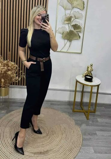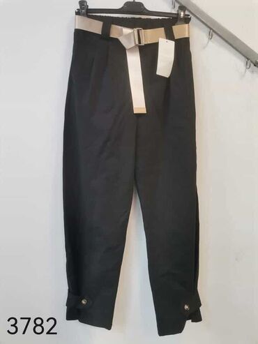 Crne ženske pantalone sa visokim strukom i širokim nogavicama koje se sužavaju ka dnu, naglašene faltama napred. Pantalone su upotpunjene dugim, bež kaišem sa zlatnom kopčom, koji se može vezati ili opušteno prebaciti preko boka. Manžetne na dnu nogavica su dizajnirane sa preklopom i ukrasnim zlatnim dugmadima, dodajući sofisticiran detalj. Idealne su za kreiranje elegantnih, poslovnih ili casual outfita.