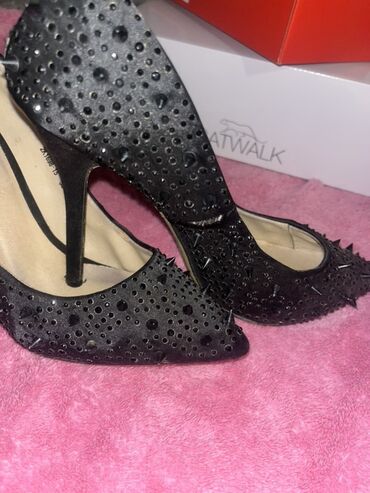CatwalkCrne ženske salonke sa špicastim vrhom i tankom štiklom. Gornji deo ukrašen crnim nitnama i kamenčićima različitih veličina koji daju efektan, rokerski izgled. Materijal sa mat satenskim finišem. Unutrašnjost svetla, sa urezanim lukom za elegantnu siluetu. Visina štikle približno 9–10 cm. Pogodne za večernje izlaske, svečanosti ili kombinovanje sa uskim pantalonama i haljinama. Moderne, upečatljive i stabilne na nozi.