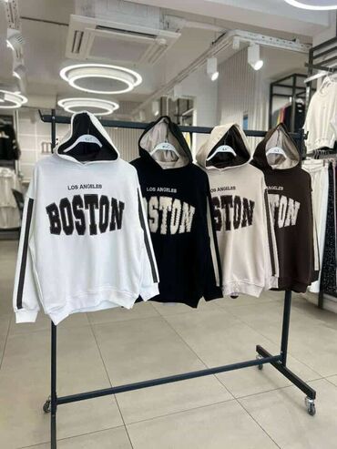 - Model “Boston/Los Angeles” hoodie: preko glave, sa kapuljačom i kengur džepom. Kontrastna postava kapuljače, traka duž rukava i veliki reljefni natpis “BOSTON” na frontu. Dostupno u kombinacijama: bela, crna, bež i braon.