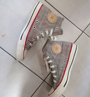 - Patike: visoki model na pertlanje, platnena tekstura u sivoj boji sa diskretnim kariranom šarom i crvenim detaljima. Gumeni đon u beloj boji sa crnom linijom, zaštitna gumena kapica napred. Okrugla kožna/eko-etiketa sa zvezdom na bočnoj strani. Klasična silueta pogodna za svakodnevno nošenje.
