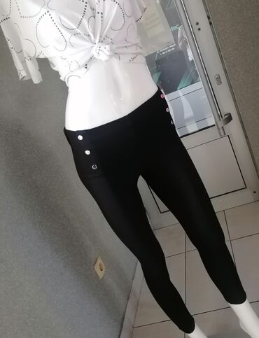 DugmadŽenske crne uske helanke/pantalone sa visokim strukom. Model je elastičan i pripijen, dužine do članka, ističe figuru i pruža udobnost za celodnevno nošenje. Sa obe bočne strane po tri dekorativna metalna dugmeta i ušivene lažne preklopne linije za efekat pantalona. Glatka, mekana tkanina bez šara, mat finiš. Praktične bočne lažne džepne linije. Idealne za kombinovanje uz majice, košulje i tunike – za svaki dan ili večernji izlazak. Boja: crna. Stil: slim/skinny, bez rajsferšlusa i bez vidljivog kopčanja – navlače se.