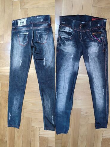 BYGEMO helanke–farmerke, veličina 34. - Tamnoplave, uske nogavice, elastičan struk bez kopčanja - Prednji “faux” džepovi i dva funkcionalna zadnja džepa - Dužina: 95 cm - Poluobim struka: 30–40 cm...