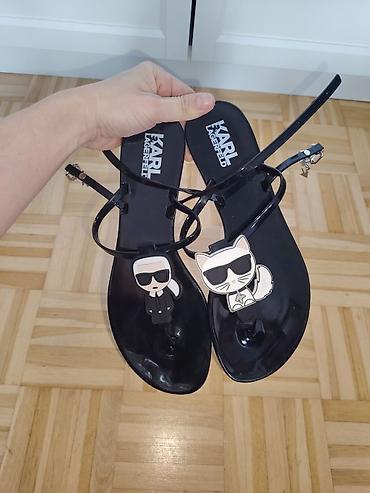 - Detalji: dekorativni bedževi – Karl i Choupette mačka na svakoj sandali; logotip KARL LAGERFELD na ulošku