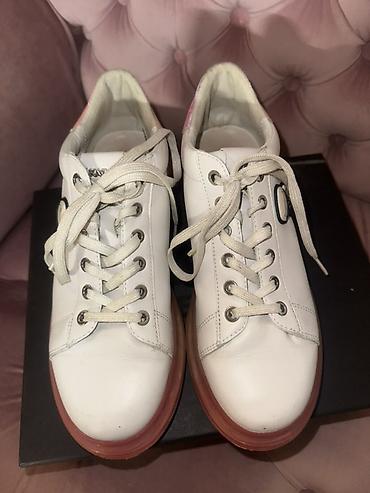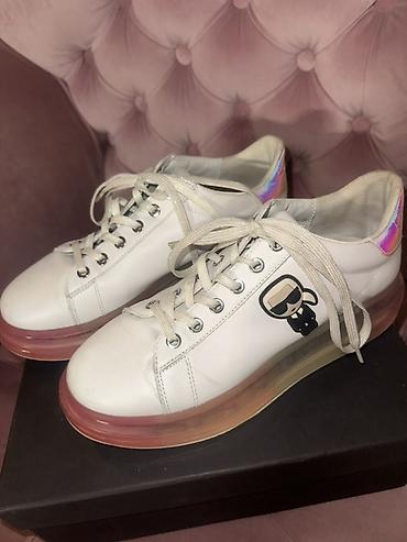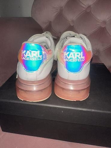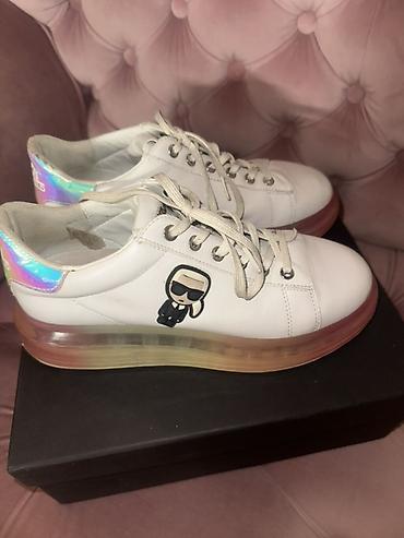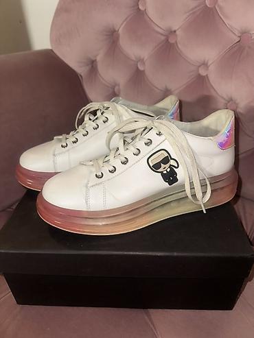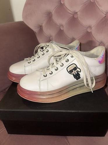 Bele patike sa platformom i karakterističnim logom/ilustracijom karl