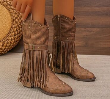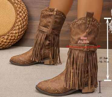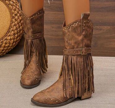 Ženske kaubojke sa resama i nitnama - Model: visoke čizme u kauboj stilu, sa bočnim patent zatvaračem - Materijal: braon veštačka koža sa vintage efektom - Dekor: duge rese oko članka, ukrasne nit...3 600 RSD