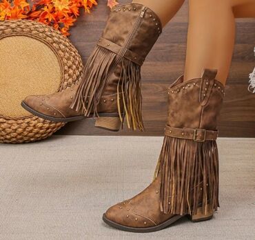 Ženske kaubojke sa resama i nitnama - Model: visoke čizme u kauboj stilu, sa bočnim patent zatvaračem - Materijal: braon veštačka koža sa vintage efektom - Dekor: duge rese oko članka, ukrasne nit...+381 63 88454xx