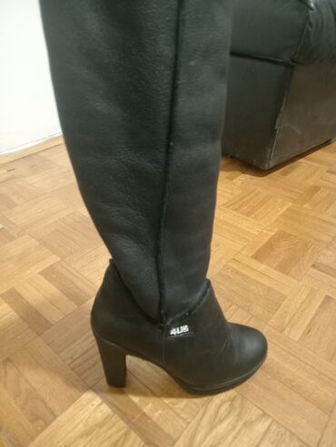 Ženske visoke čizme do kolena, crne. U savršenom stanju, nošene samo po sobi, prodajem zato što su mi male. - Materijal: gornji deo kombinacija glatke eko-kože i elastične tekstilne strane koja ...
