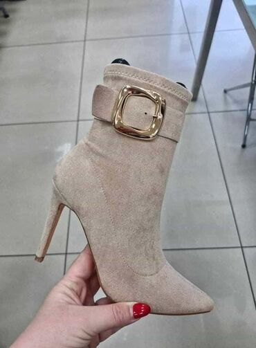 Elegantne salonke-čizme na štiklu – bež - Materijal: meki brušeni izgled (antilop efekat) - Tanka visoka potpetica (stiletto) - Špicasti vrh - Dekorativni široki kaiš oko članka sa velikom zlatn...