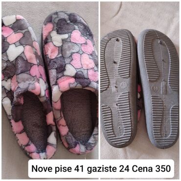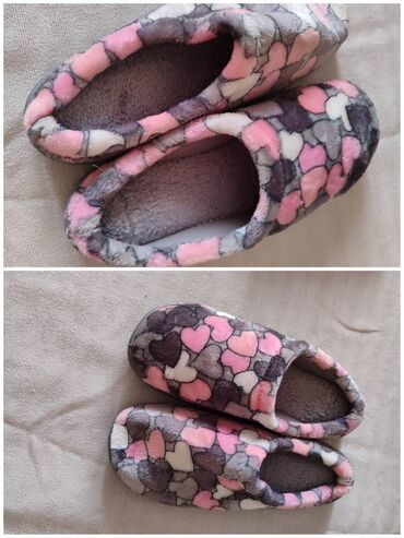 Kućne papučeŽenske kućne papuče sa printom srca u nijansama roze, sive i bele. Mekani plišani gornjište i prijatna flis postava za toplinu i udobnost. Zatvoren model sa blagim otvorom na ristu, pogodan za svakodnevno nošenje po kući. Fleksibilan gumeni đon sa utorima za bolje prijanjanje.
