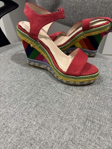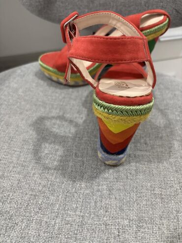 - Peta: visoka wedge platforma, višebojna (pruge u zelenoj, crvenoj, narandžastoj, žutoj, roze, plavoj), sa dekorativnim pletenim rubom u zelenoj/žutoj nijansi