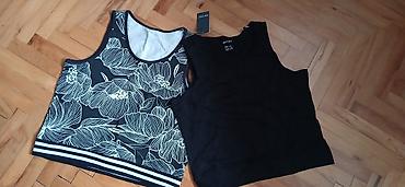 - Model: jedan jednobojni crni top i jedan top sa crno‑belim floralnim printom i prugastim rubom