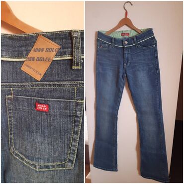 - Detalji: 5 džepova, metalno dugme i rajsferšlus, kontrastni žuti šavovi, crveni Miss Dolce logo na prednjem i zadnjem džepu, kožna etiketa pozadi