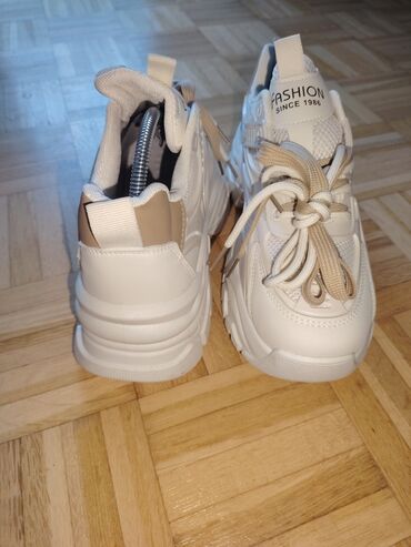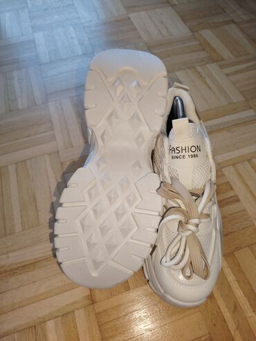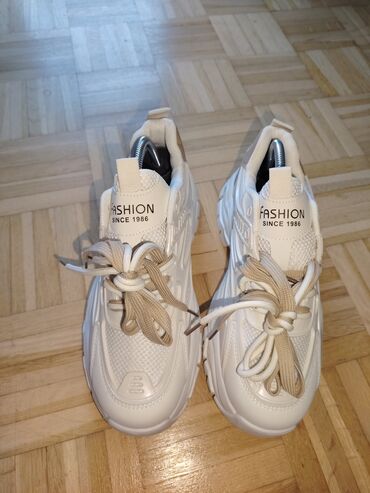 Predstavljamo ženske modne patike u beloj boji sa bež pertlama, idealne za svakodnevno nošenje. Patike imaju robustan đon sa izraženim teksturama, što doprinosi udobnosti i stabilnosti. Gornjište je kombinacija materijala, uključujući mrežaste panele za prozračnost i sintetičke slojeve za potporu. Na jeziku patike nalazi se natpis "FASHION SINCE 1986", dodajući im prepoznatljiv modni detalj. Ove patike su pogodne za različite ležerne kombinacije i aktivnosti koje zahtevaju udobnu obuću.