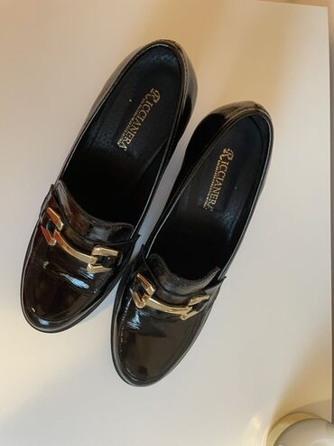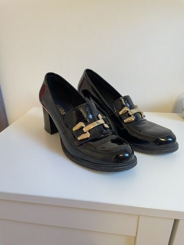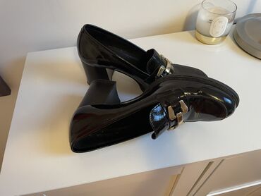 Lakovana kožaCrne italijanske kožne cipele visokog sjaja, sa debelom potpeticom i ukrasnom metalnom kopčom zlatne boje. Cipele su udobne i stabilne, pogodne za svakodnevno nošenje ili poslovne prilike, pružajući sofisticiran izgled. Broj 40