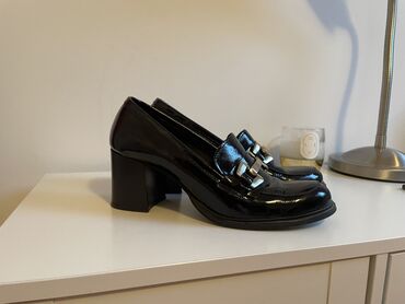 Crne ženske mokasine – lakovana koža, klasičan penny dizajn. - Brend/oznaka: Comfort (natpis na ulošku) - Veličina: 39 (otisnuto sa strane) - Materijal gornjišta: sjajni lak (lakovana završna...1 600 RSD