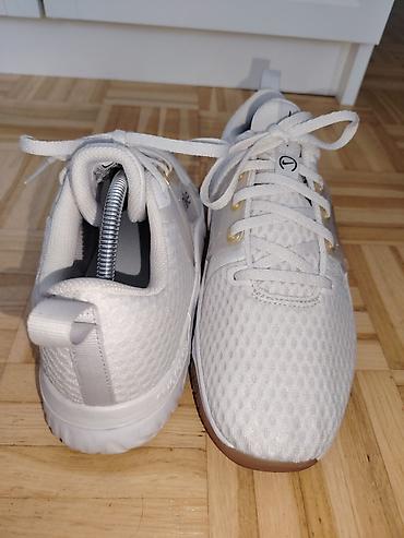 Elegantne bele patike sa zlatnim akcentima, lagane i stabilne, idealne za vežbanje i urbani stil.