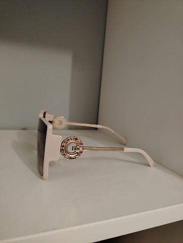 - Detalj: ukrasni kružni element sa slovom „G“ na spoju drški i rama, ukrašen višebojnim kamenčićima (crveni, zeleni, plavi, providni) – upadljiv, glamurozan akcenat.