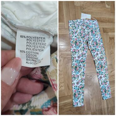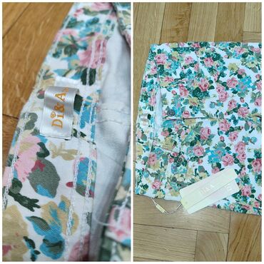 Ženske pantalone Di&A (Diamant Angel), model DA8906, veličina M. Belo osnovna boja sa cvetnim printom u roze, zelenim i plavim tonovima. Uski kroj (skinny), klasičan struk sa kopčanjem na dugme i rajsferšlus, pet džepova. Materijal: 65% poliester, 35% pamuk. Dimenzije: dužina 97 cm, poluobim struka 35–43 cm (elastično), dubina 22,5 cm. Na etiketi naznačena cena 18€. Cena: 1200 din.