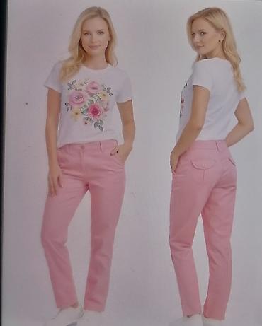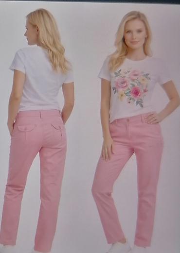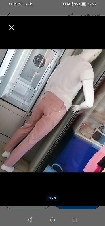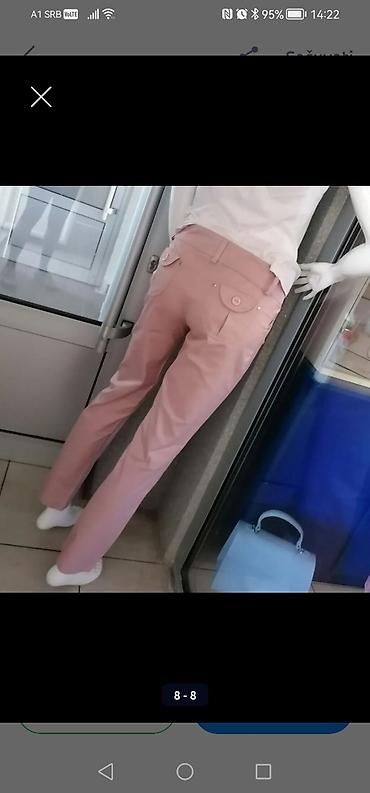 Ženske slim-fit pantalone, svetloružičaste boje. - Kroj: uske nogavice, srednji struk, dužina do članka - Kopčanje: rajsferšlus i dugme napred - Džepovi: dva klasična prednja džepa + mali novčanik...