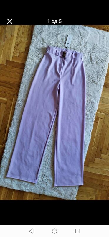 Ženske pantalone u pastelno ljubičastoj boji. Model sa visokim strukom i ravnim, širokim nogavicama. U struku se nalazi širi pojas sa dva dekorativna dugmeta napred i otvorima za kaiš. Pantalone imaju plisirane detalje ispod pojasa, zatvaranje napred (skriveni rajsferšlus/dugme), kao i uredno porubljene nogavice. Materijal je glatke teksture, pogodan za svakodnevne i poluformalne kombinacije. Na etiketi je brend “Zara Basic”. Ukupno elegantan kroj koji lepo prati liniju i lako se uklapa uz košulje, topove i sakoe.