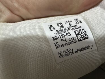 U slikama je i etiketa sa veličinama (UK 3.5 / EUR 36 / US Women’s 6 / 22.5 cm) i šifrom 383119‑03, što se odnosi na Puma proizvod; same patike na fotografijama su Fila crno‑bele.