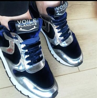 - Dizajn: tamnoplavo plišano gornjište sa srebrnim metalik panelima i sjajnim pertlama; prepoznatljiva Voile Blanche etiketa na jeziku.