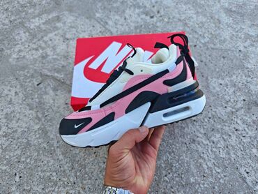 Nike patike – Air Max silueta sa platformom - Model: Nike lifestyle patike inspirisane Air Max dizajnom, sa vidljivom Air jedinicom u peti i debelim, stabilnim đonom. - Boje: kombinacija bele, sve...