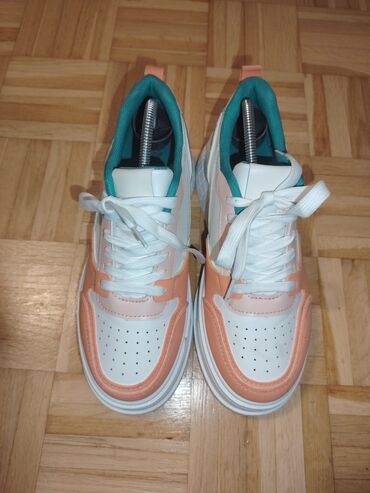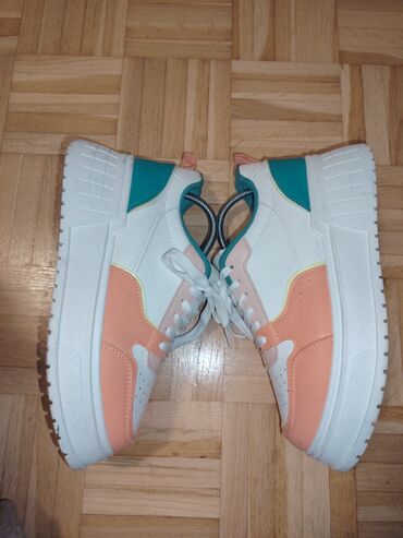 - Boje: bela osnova sa koralno‑narandžastim i svetlo‑roze panelima, tirkizni deo oko pete i unutrašnjosti; diskretan žućkast detalj sa strane