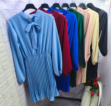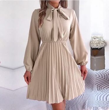 - Model: kratka A-kroj silueta sa visokim strukom, dugi rukavi sa blago naduvanim manžetnama, plisirana suknja, kravata/mašna oko okovratnika