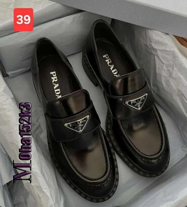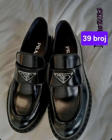 39💥Prada ženske loafer cipele – model sa metalnim trokutastim logom na gornjištu.