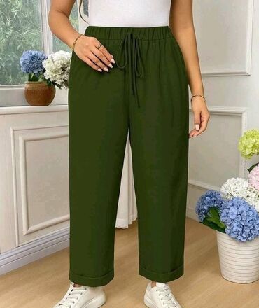 Ženske pantalone – maslinasto zelene, model sa visokim strukom i jogger krojem. - Struk: visoki pojas sa dva dekorativna/dvostruka dugmeta napred. - Kroj: sužene nogavice sa elastičnim ranflama na...