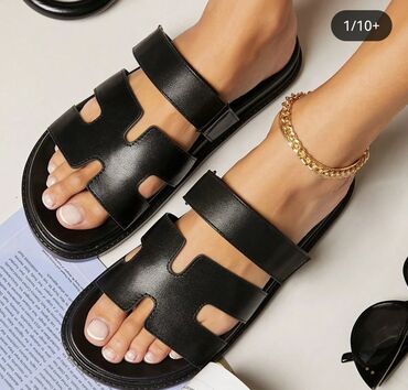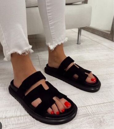 UpotrebljenоŽenske ravne sandale u crnoj boji, sa dve široke trake preko risa. Jedna traka je puna, dok druga ima izrezane detalje koji formiraju slovo "H" ili sličan geometrijski motiv. Sandale su dizajnirane za udobnost i lakoću nošenja, idealne za svakodnevne aktivnosti tokom toplijih meseci. Đon je ravan i robustan, što omogućava stabilan korak. Lako se kombinuju sa različitim stilovima odeće, od ležernih do nešto elegantnijih kombinacija. Izrađene su od materijala koji podseća na kožu ili antilop, pružajući prijatan osećaj na stopalu.