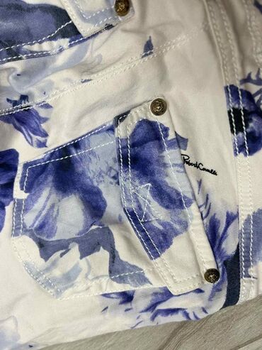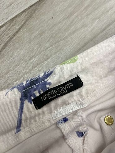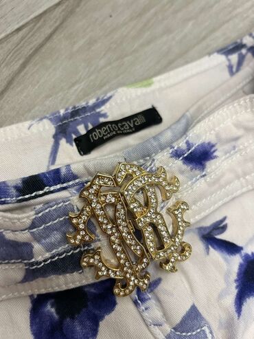 - Detalji: dekorativna zlatna kopča sa RC monogramom ukrašena kristalima; metalni nitne i dugmad sa logotipom; potpis „Roberto Cavalli“ na zadnjem džepu