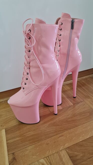 Ružičaste platforme/štikle na pertlanje sa visokim potpeticama Brend FITPOLE - NOVE NENOŠENE - Model: gležnjače sa visokom platformom i tankom štiklom - Materijal: lak koža (sjajna završnica) - ...+381 60 32361xx