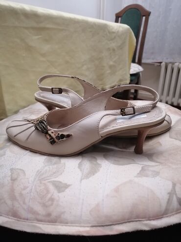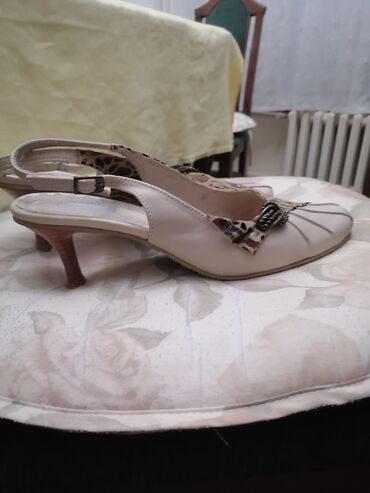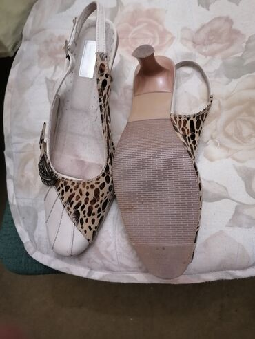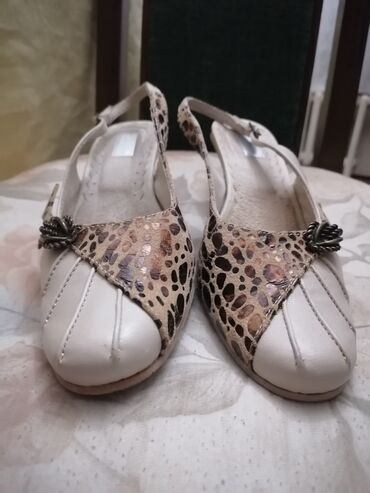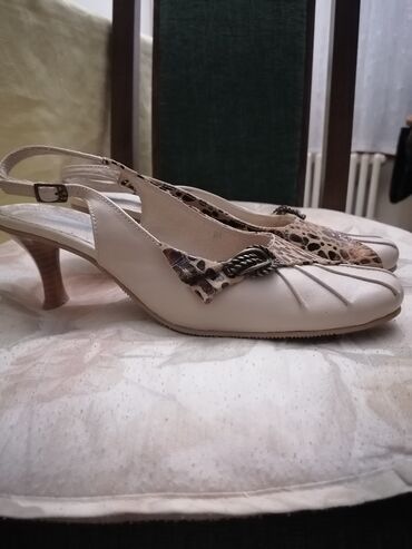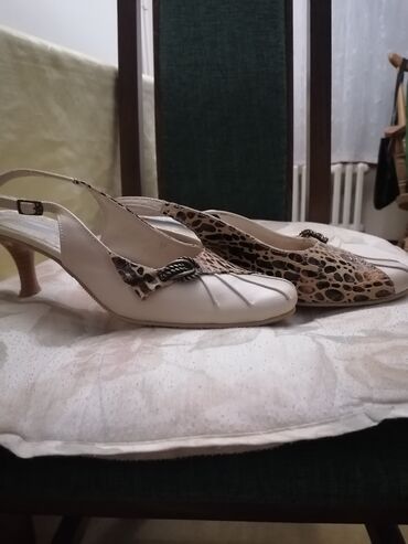 Ženske sandale sa otvorenom petom i klinasto-sečenim vrhom. Kombinacija bež/boje slonovače i dela sa animal printom u braon tonovima. Ukrasna metalna broška u obliku lista na prednjem delu. Gornjište od glatke veštačke/kože nalik koži sa dekorativnim štepovima. Podesiv kaišić oko pete sa metalnom kopčom. Stabilna tanka potpetica oko 5–6 cm, prirodnog drvnog izgleda. Gumeni đon sa protivkliznim šarama. Mekani uložak za udobnost. Elegantne i pogodne za svečane prilike ili svakodnevno nošenje uz haljine, suknje i pantalone.