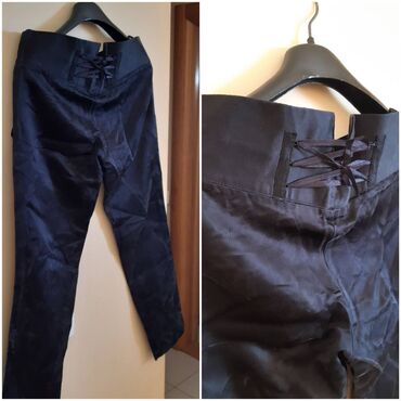 Tamne uske pantalone/helanke sa dva dugmeta napred i pet džepova (prednji funkcionalni, zadnji paspulirani). Materijal: 97% pamuk, 3% elastan – rastegljive i udobne. Veličina: M. Dužina: 96 cm. Pol...
