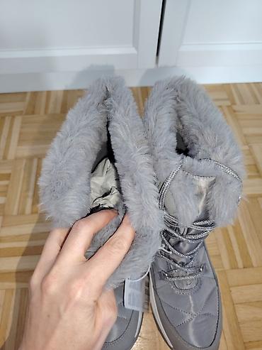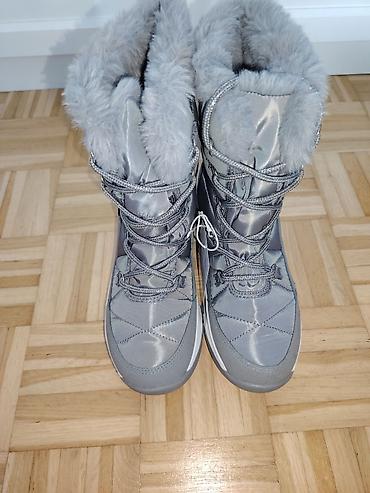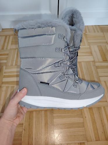Ženske zimske čizme sa krznom - Model: visoke, tople zimske čizme sa bogatom krznenom postavom i rubom - Boja: siva/srebrna sa diskretnim sjajem na gornjištu - Vezivanje: dekorativne/elastične per...