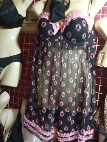 - Model 1: Crna baby‑doll spavaćica sa roze printom poljubaca. Mekani, oblikovani korpeli sa volanima i mašnicom, providan til preko tela, dužina do sredine butina, porub ukrašen duplim roze volanom. Vezivanje oko vrata.