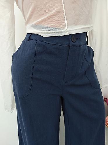 Bershka pantalone – model Straight - Boja: intenzivno plava sa kontrastnim belim štepovima - Kroj: straight (prav), srednji struk, široke nogavice - Veličina: EU 36 / USA 04 / MEX 26 (vidljivo na ...