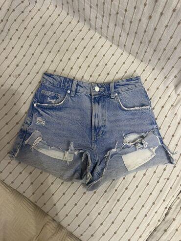 Ženske teksas šorts bermude – svetloplava isprana nijansa, sa izraženim „distressed“ detaljima i pohabanim porubom. Klasičan kroj sa srednje visokim strukom, kopčanje na dugme i rajsferšlus. Pet džepova: dva prednja, jedan mali kovanica džep i dva zadnja džepa. Pojasevi za kaiš oko struka. Nepravilno poderani delovi napred sa kontrastnim podstavama koje proviruju, kao i diskretna „iznošenost“ na zadnjim džepovima. Materijal: 100% pamuk (klasičan denim bez elastina). Moderno ležeran izgled, idealno za leto i svakodnevne kombinacije. Boja: svetli denim sa efekatom izbledele pranja.