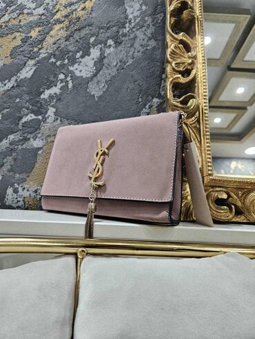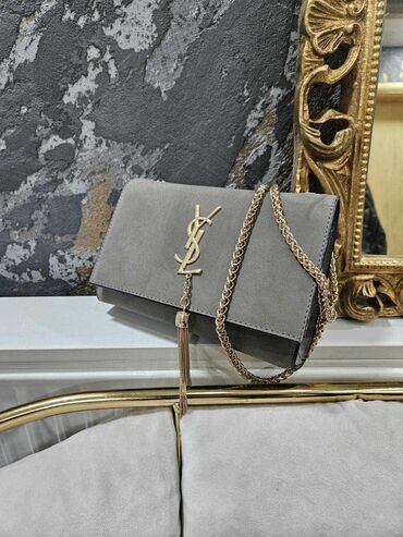- Male torbe/kvačevi sa poklopcem i lančanim kaišem u zlatnoj boji za nošenje preko ramena ili ukoso. Na prednjoj strani metalni monogram i resica. Dostupne boje: siva antilop varijanta, tamnoplava glatka koža, i puder‑roze antilop varijanta. Kompaktne dimenzije – taman za telefon, ključeve i osnovne potrepštine za večernji izlazak ili svečane prilike.