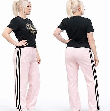 Ženske trenerka pantalone – svetloružičaste sa crnim prugama - Model: ravnog, opuštenog kroja - Boja: svetloružičasta - Detalji: tri uzdužne crne pruge sa obe strane nogavica - Struk: elastični po...