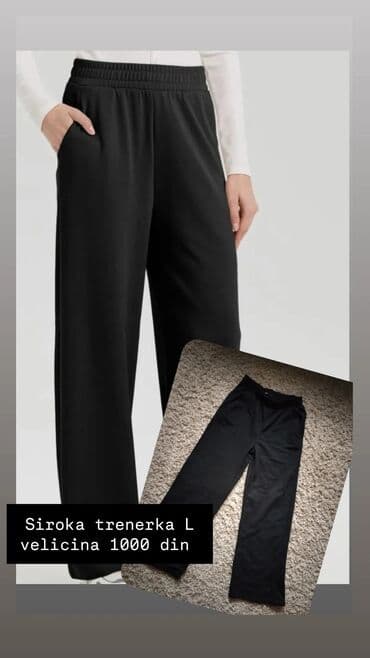Široke crne trenerke – veličina L - Kroj: široke nogavice, opušten fit - Struk: elastičan pojas sa naborima za udobno pristajanje - Džepovi: bočni, funkcionalni - Materijal: mekana, glatka tkanina...